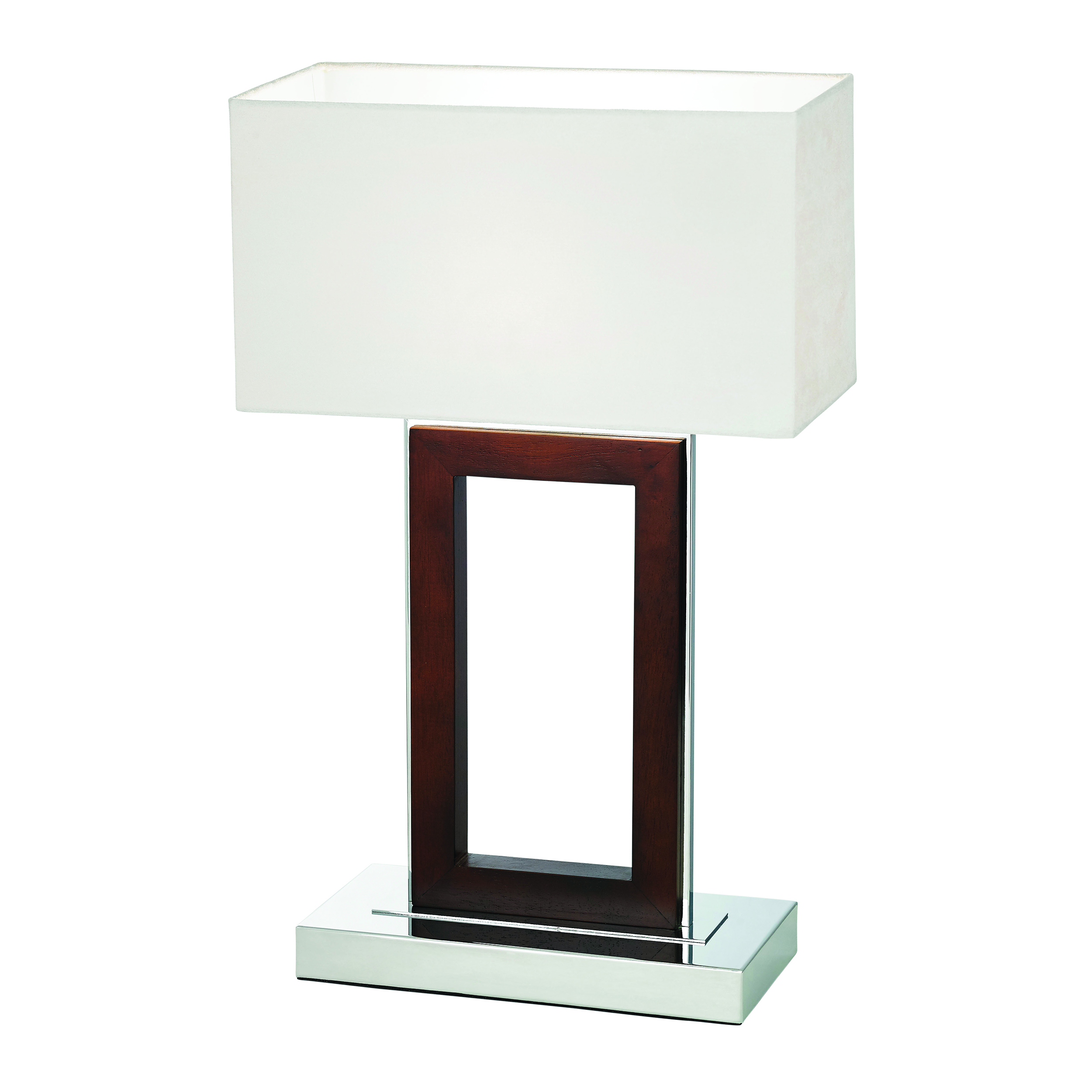 The Portal table lamp mixes dark wood with polished chrome on the base, along with a cream faux suede shade. Supplied with an inline switch and suitable for use with LED lamps