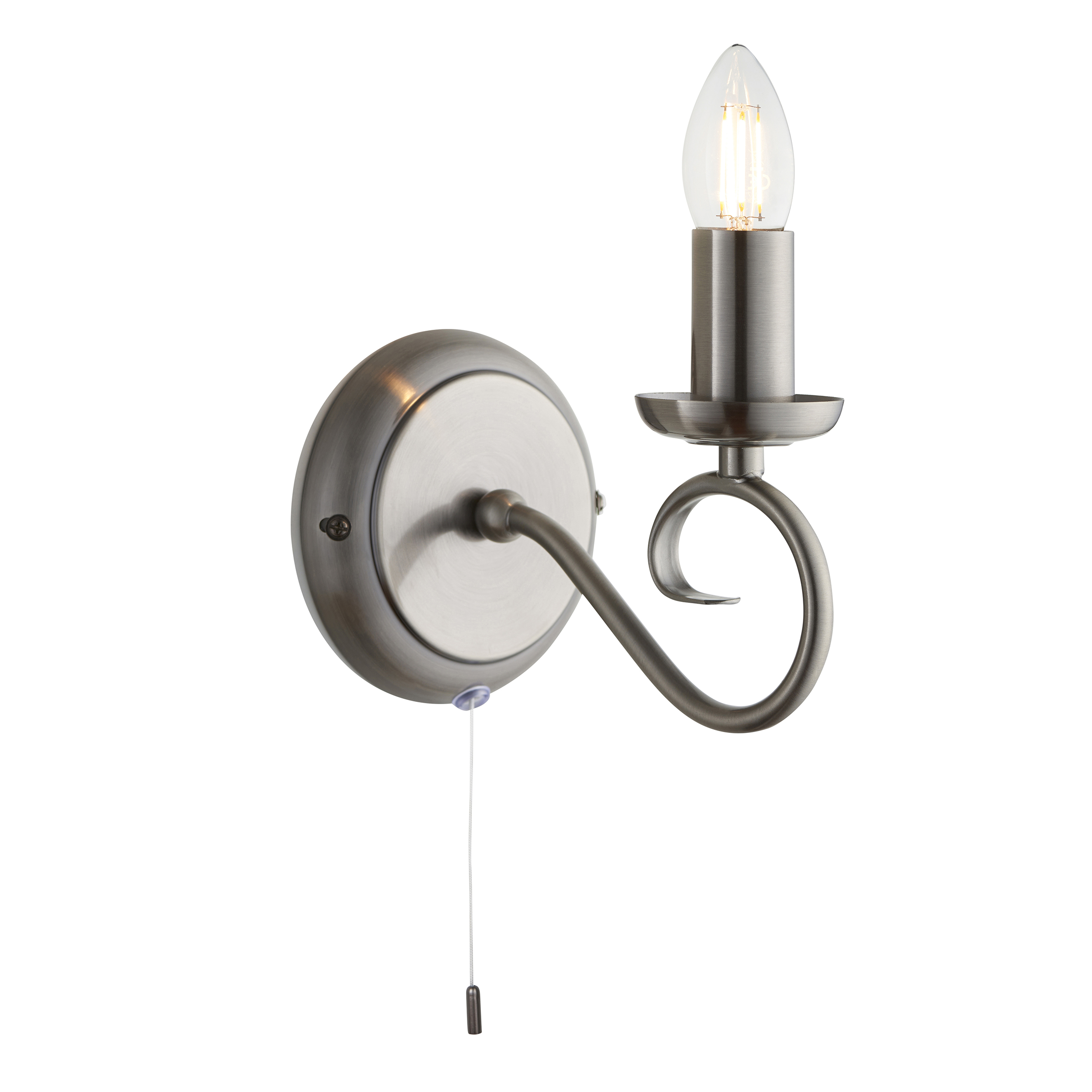 The Trafford single wall light is supplied with a pull cord switch, finished in antique silver effect, this fitting is also suitable for use with LED lamps and is dimmable. Other options and finish also available