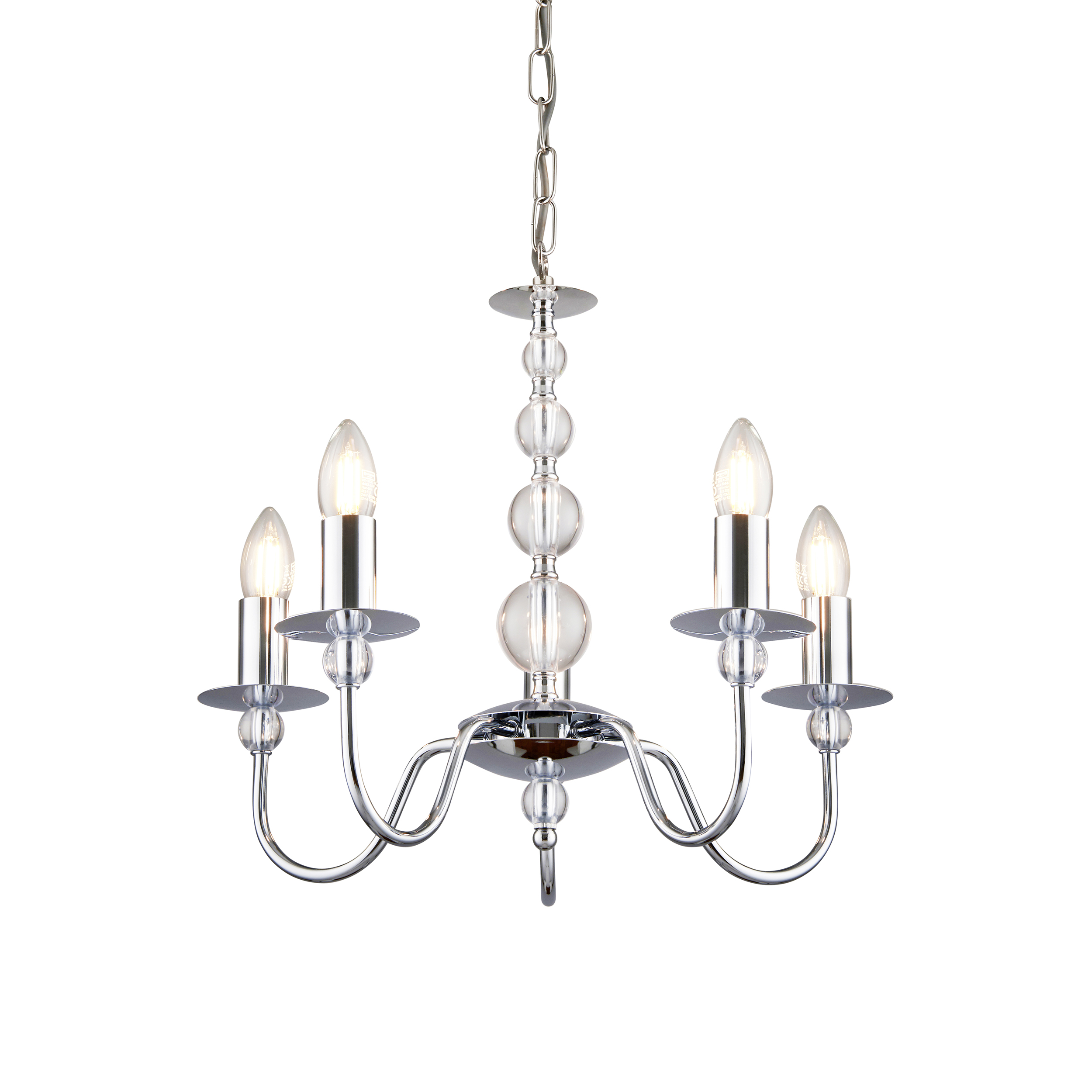 This 8 light ceiling fitting has glass sphere detailing and a shiny chrome effect finish. Height adjustable at time of fitting. Can be converted to a flush fitting. Matching items available