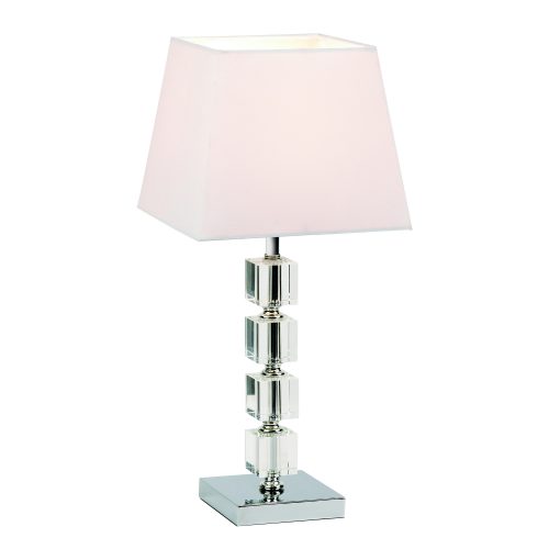 This table lamp has a polished chrome finish and a stem made up of stacked acrylic cubes with a cream fabric shade. Suitable for use with LED lamps and supplied with inline switch