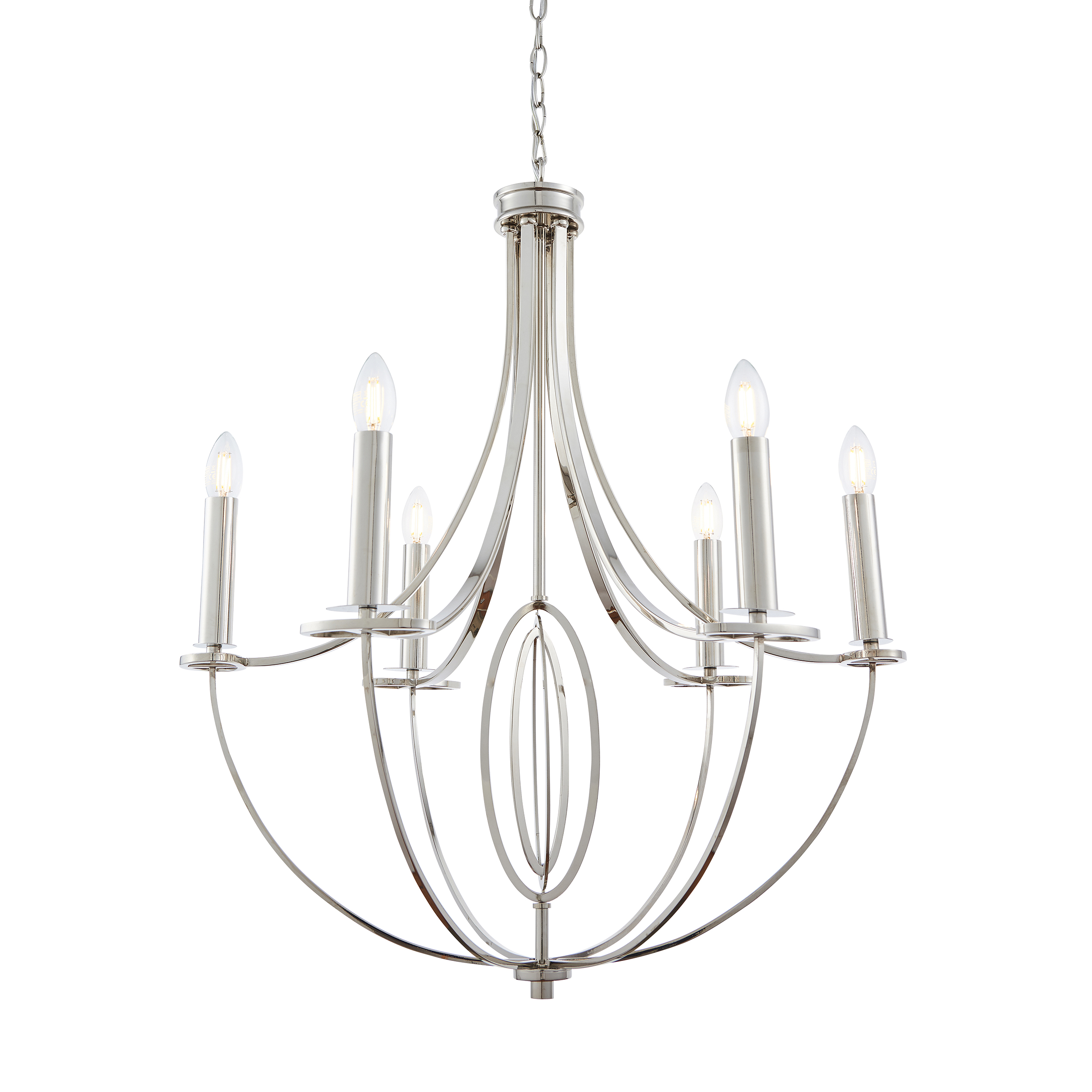 The Whistle is a simple 6 light fitting with a nickel plate finish. suitable for use with LED lamps, this fitting is also dimmable and has an adjustable drop. Medium sized pendant also available