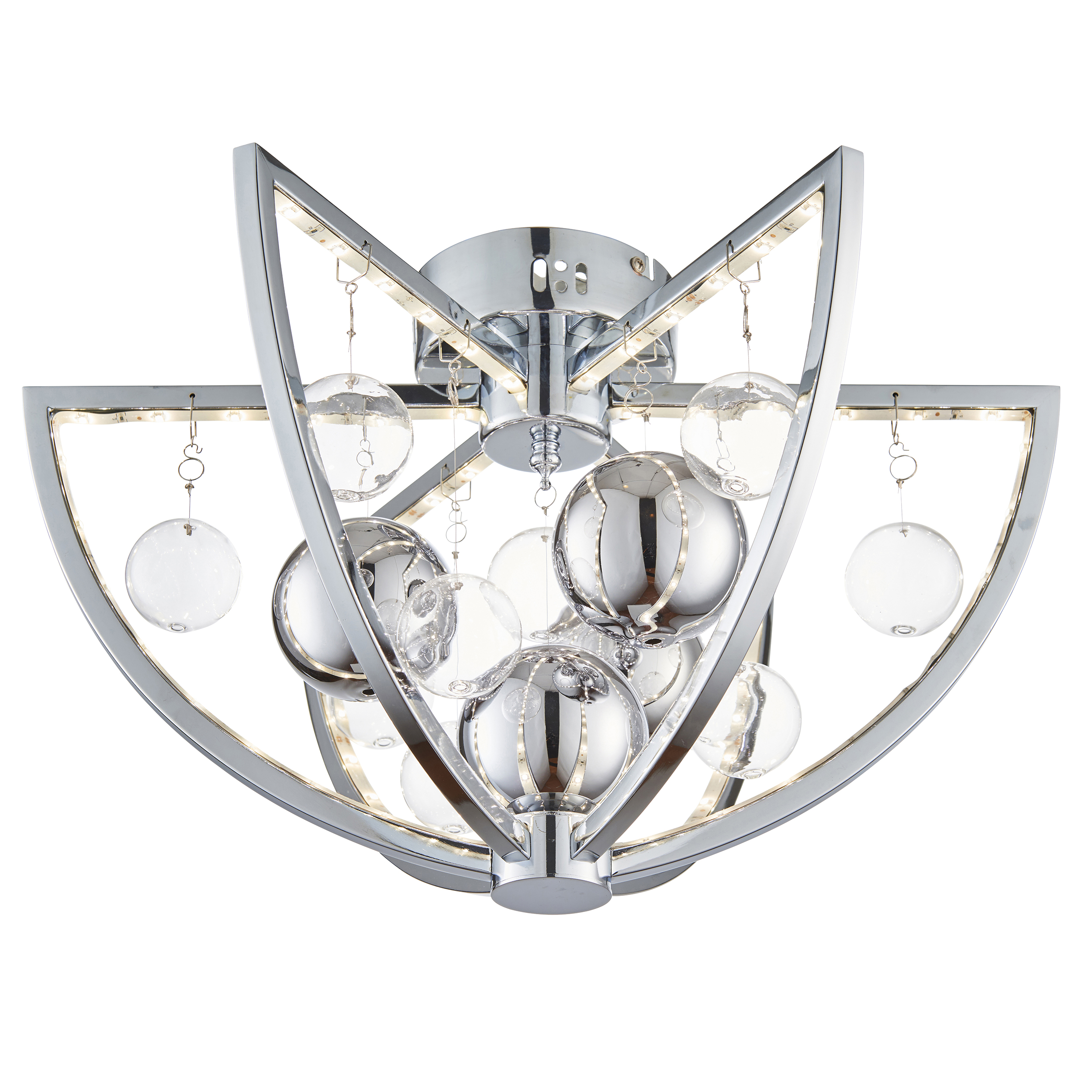 A striking LED flush with a polished chrome finish with a mix of clear and chrome spheres suspended at various heights within the integrated LEDs semi circle rings, creating a stunning modern design.