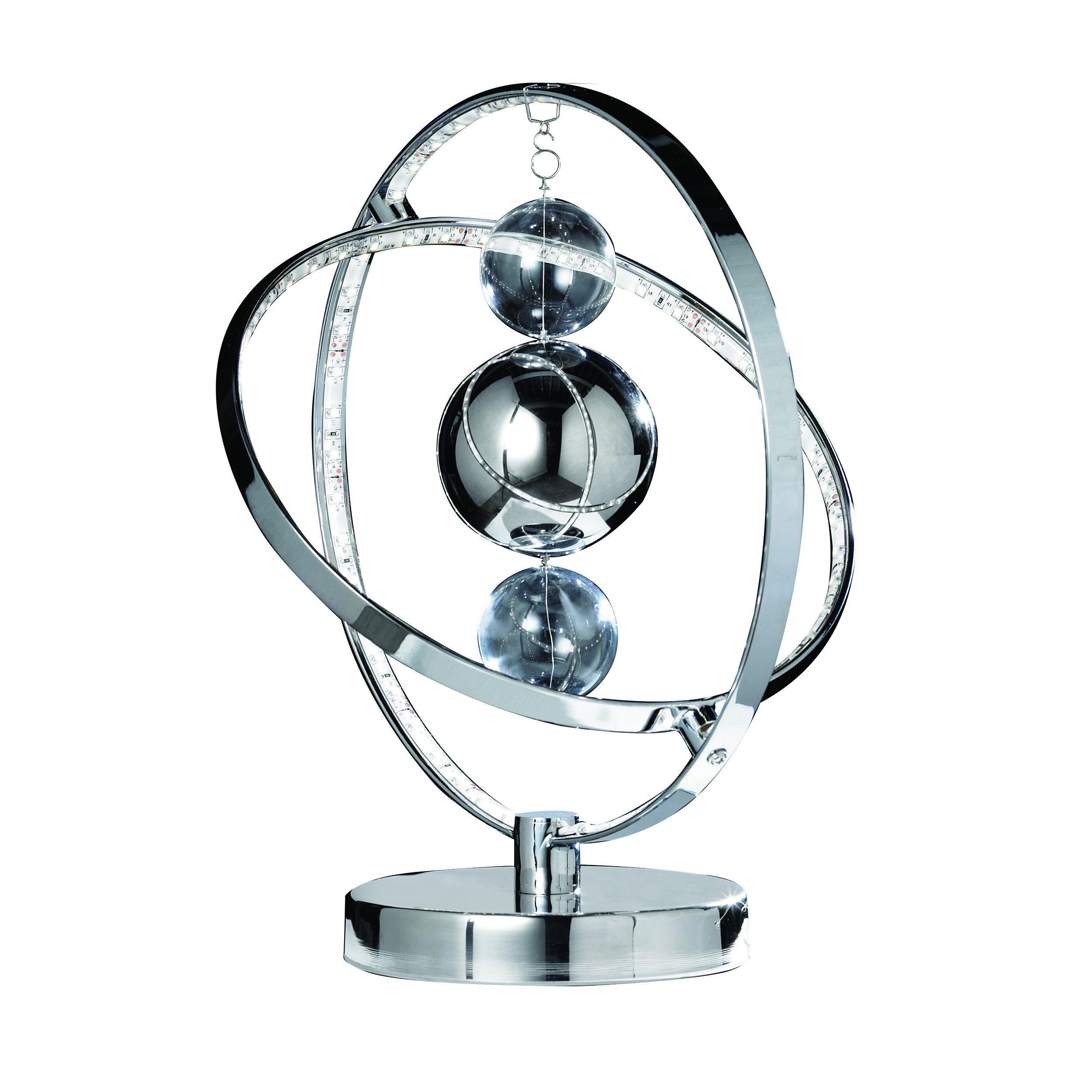 A striking LED table lamp with a polished chrome finish with a mix of clear and chrome spheres suspended at various heights within the integrated LED outer rings, creating a stunning modern design.