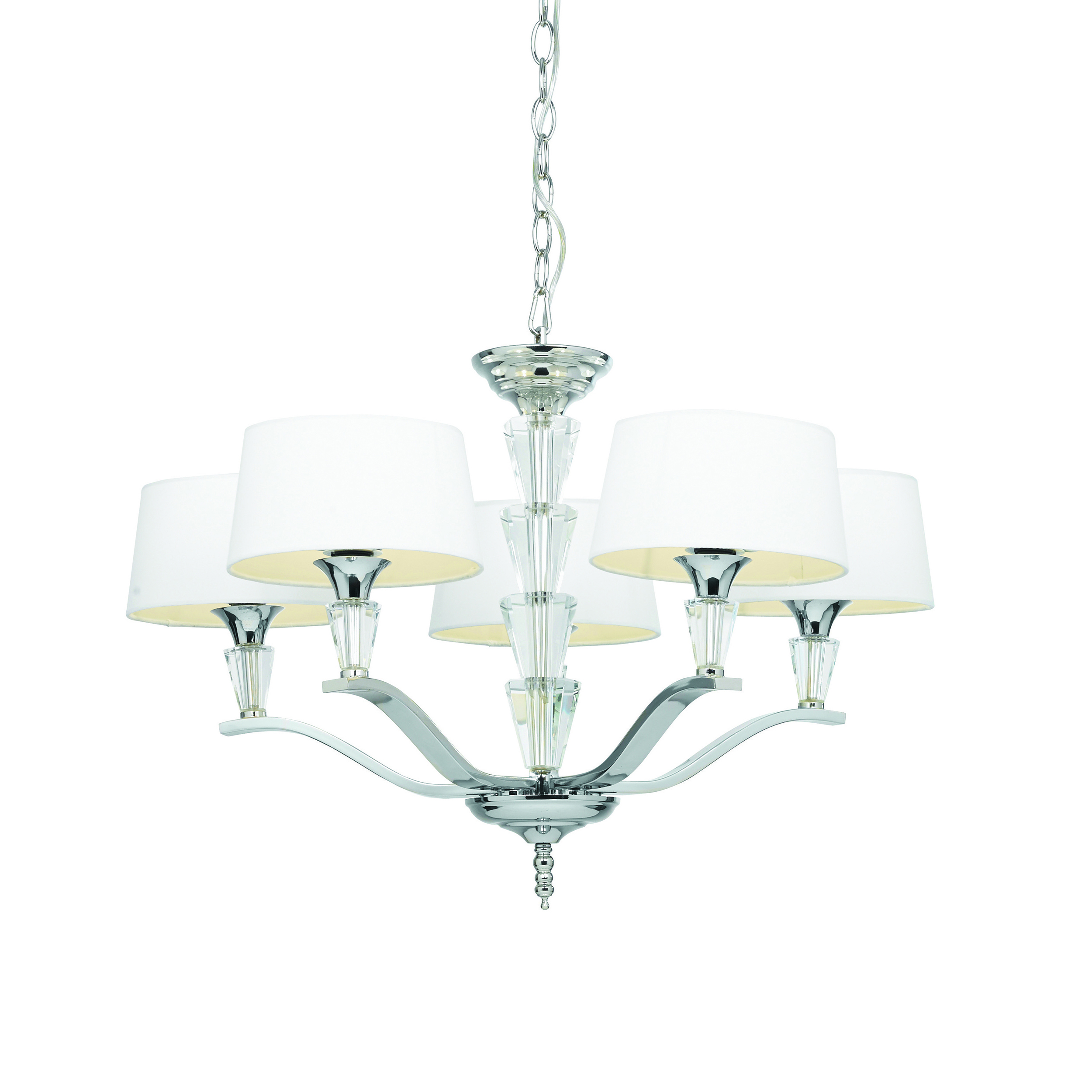 The Fiennes 5 light fitting finished in chrome effect with crystal detailing and white fabric shades. This fitting has a adjustable drop, is dimmable and suitable for use with LED lamps. Matching wall and table lamp also available