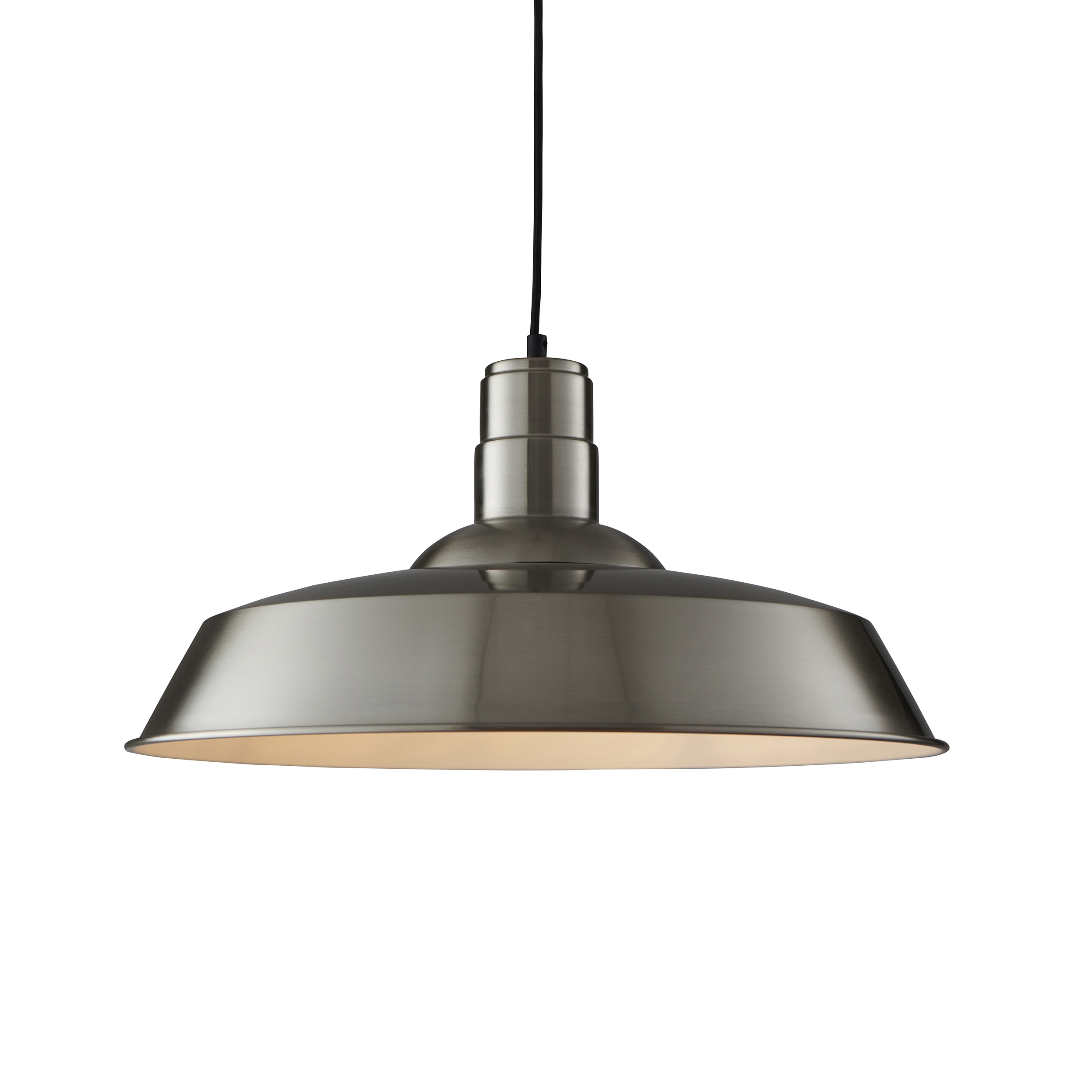 A shiny metal pendant with a nickel finish. An adjustable drop, dimmable and suitable for use with LED lamps