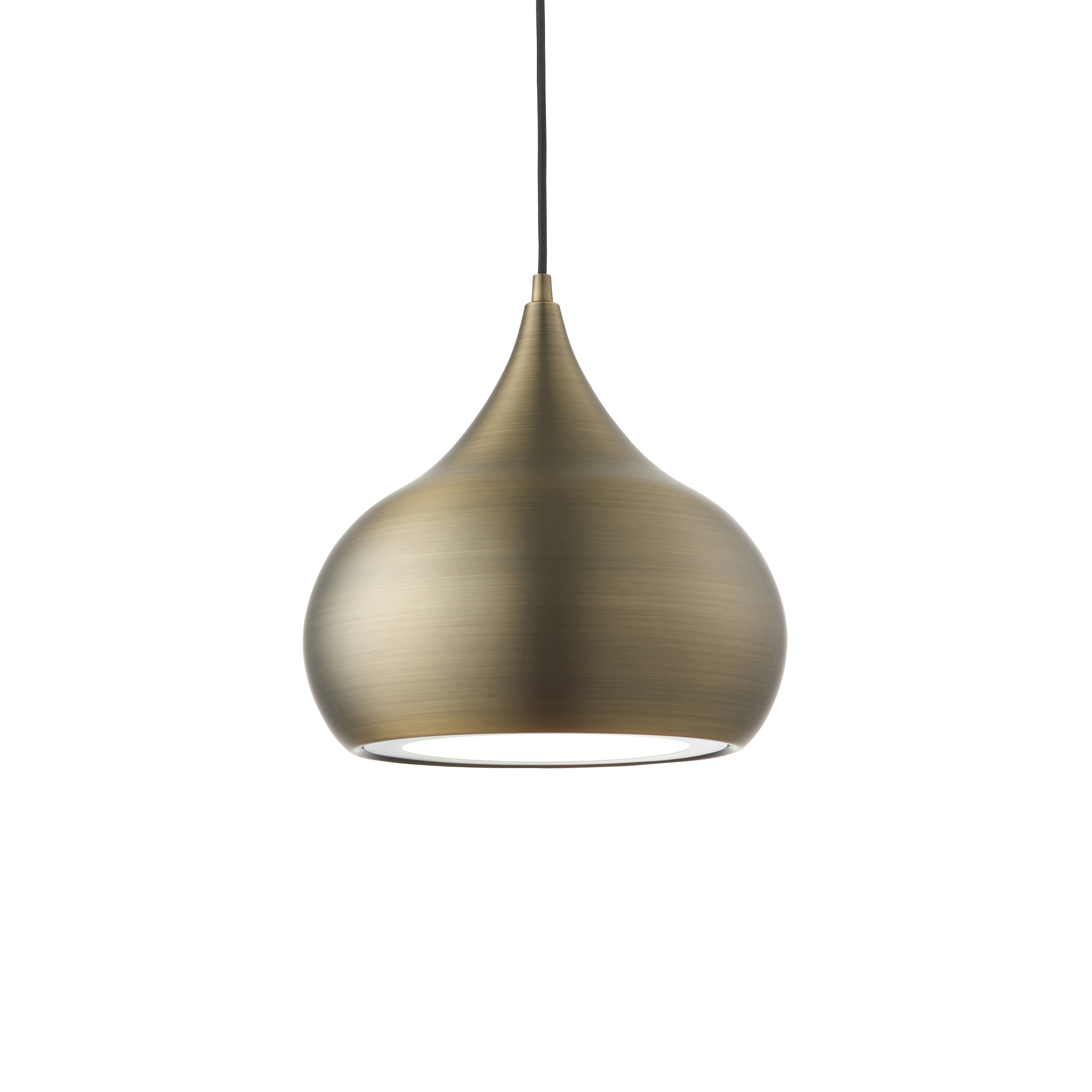 Elegantly curved LED pendant finished in a soft matt antique brass effect plate and dimmable