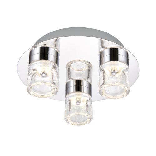 A 3 light LED flush ceiling fitting finished in a chrome plate with robust glass bubble shades. Comes complete with an LED driver, IP44 so suitable for use within the bathroom. Low maintenance costs. Also available in a 5 light version