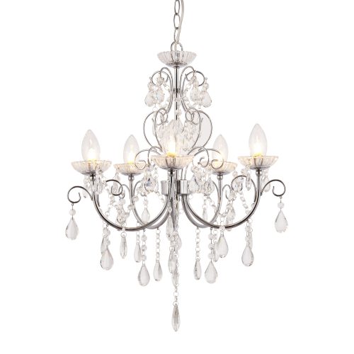 The Tabitha 5 light semi flush ceiling fitting is finished in a chrome effect plate with clear crystal glass detail and droplets. IP44 rated so suitable for use in the bathroom, dimmable and suitable for use with LED lamps. Matching items available