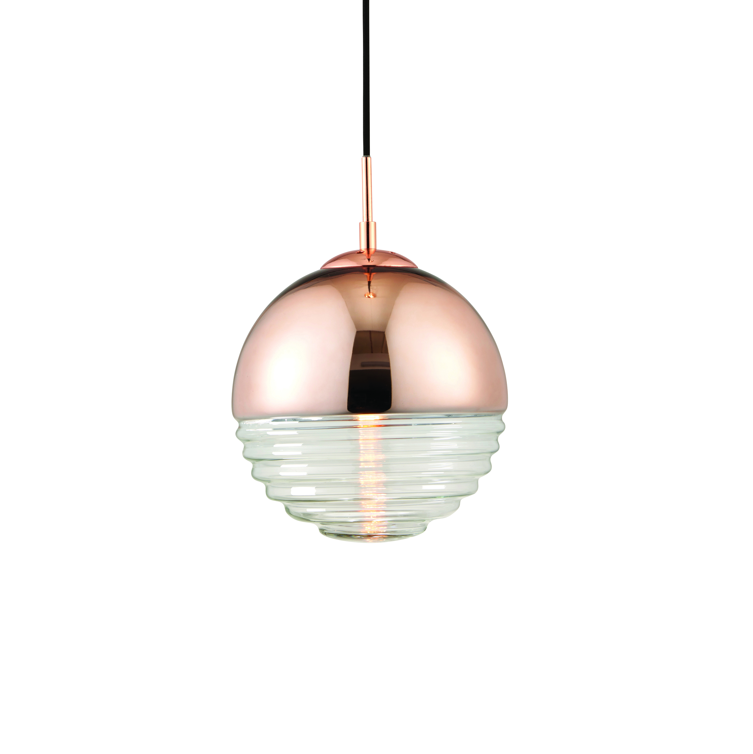 A simple, copper plated and clear ribbed spherical ceiling pendant. Adjustable drop, suitable for use with LED lamps and dimmable. Other colour options available