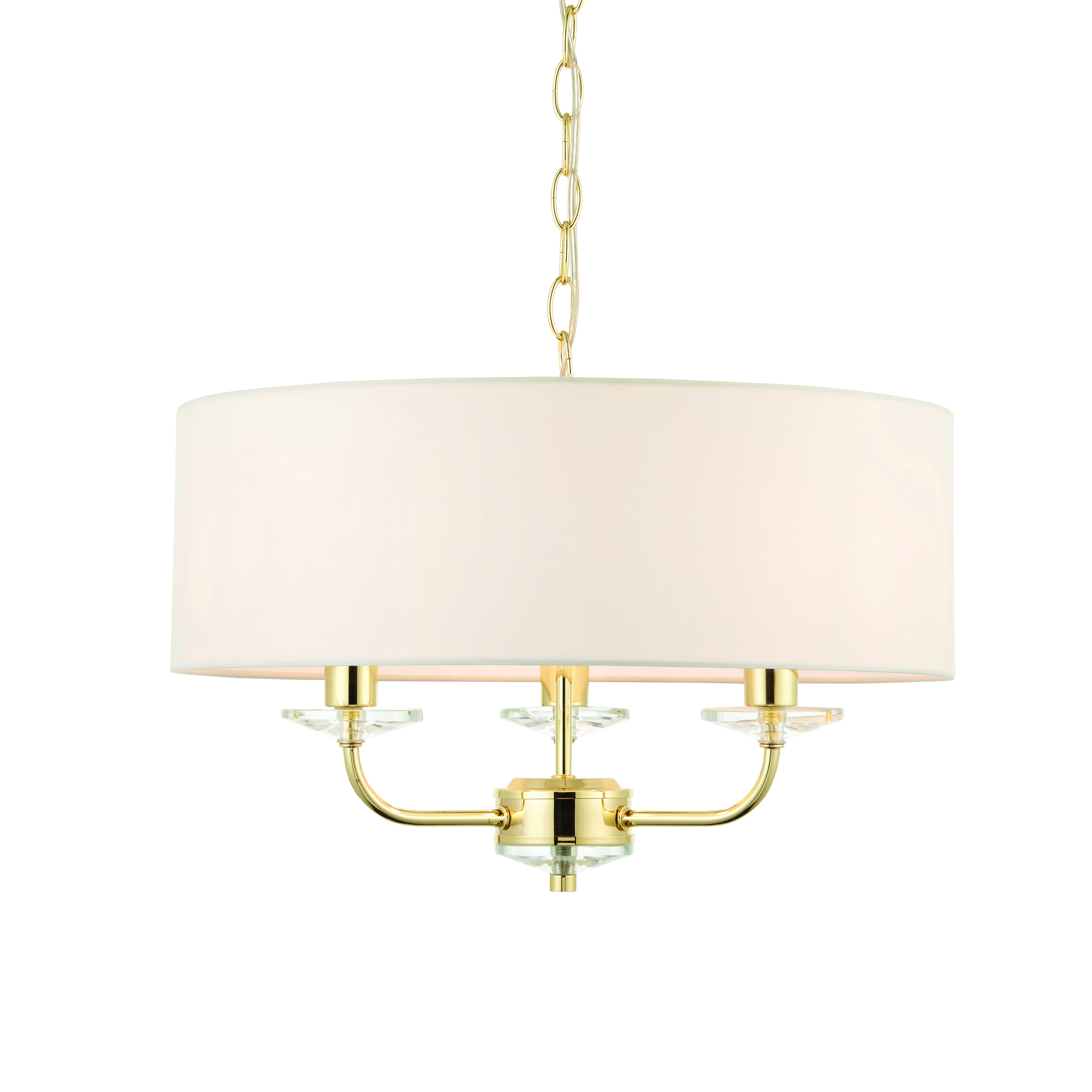 The Nixon 3-light ceiling pendant is finished in a brass effect plate. The 3 arms are complemented with a touch of crystal and the fitting is topped with a narrow, vintage white, faux silk shade. Height is adjustable, and the fitting is dimmable and suitable for use with LED lamps. Matching items and alternative finish available