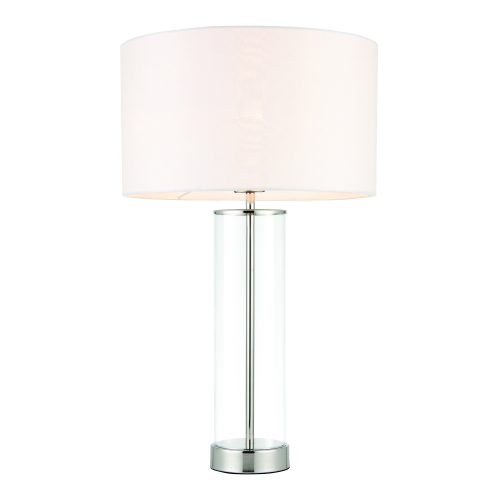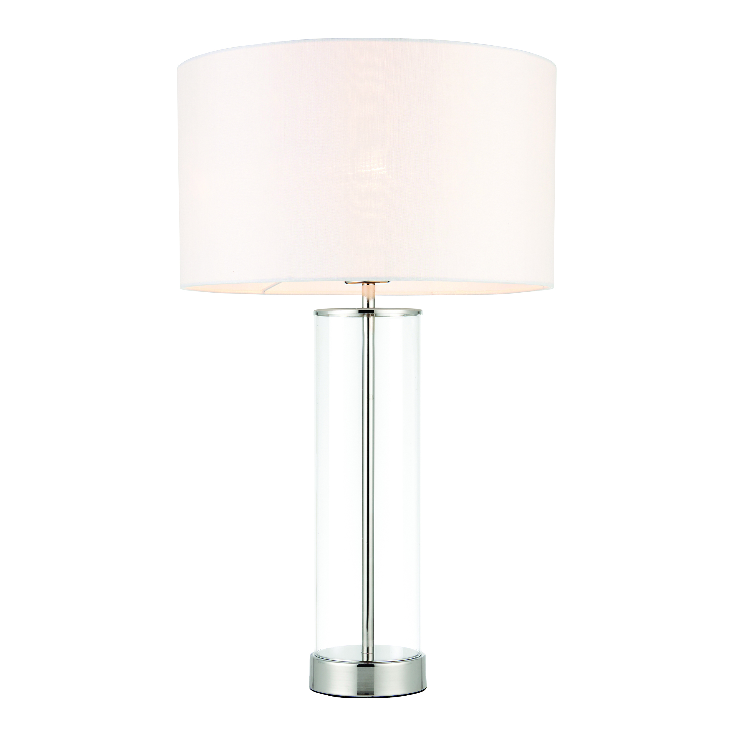 Beautifully simple table light with a clear glass base, vintage white faux silk shade and a bright nickel effect finish. Dimmable via a clever 3 stage touch dimmer