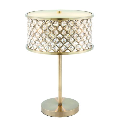 A 2 light table light with an antique brass finish. The shade is made of crystal beads with an opal diffuser to the top. Supplied with an inline switch and suitable for use with LED lamps. Matching items available.