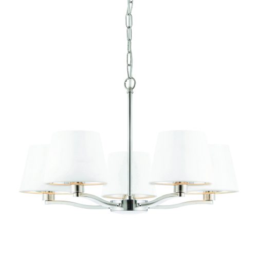 The Harvey 5 light pendant is finished in bright nickel plate and complemented by vintage white, faux silk shades each with metallic silver inner, for the perfect sophisticated boutique hotel look. Matching items also available.