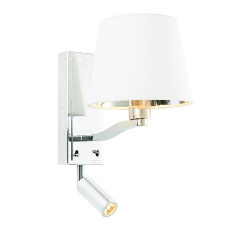 The Harvey wall and reading light is finished in bright nickel plate complemented by a vintage white, faux silk shade, with a silver lined, vintage white, faux silk shade. Featuring an additional, adjustable LED reading light, for the perfect sophisticated boutique hotel look. Matching items also available.
