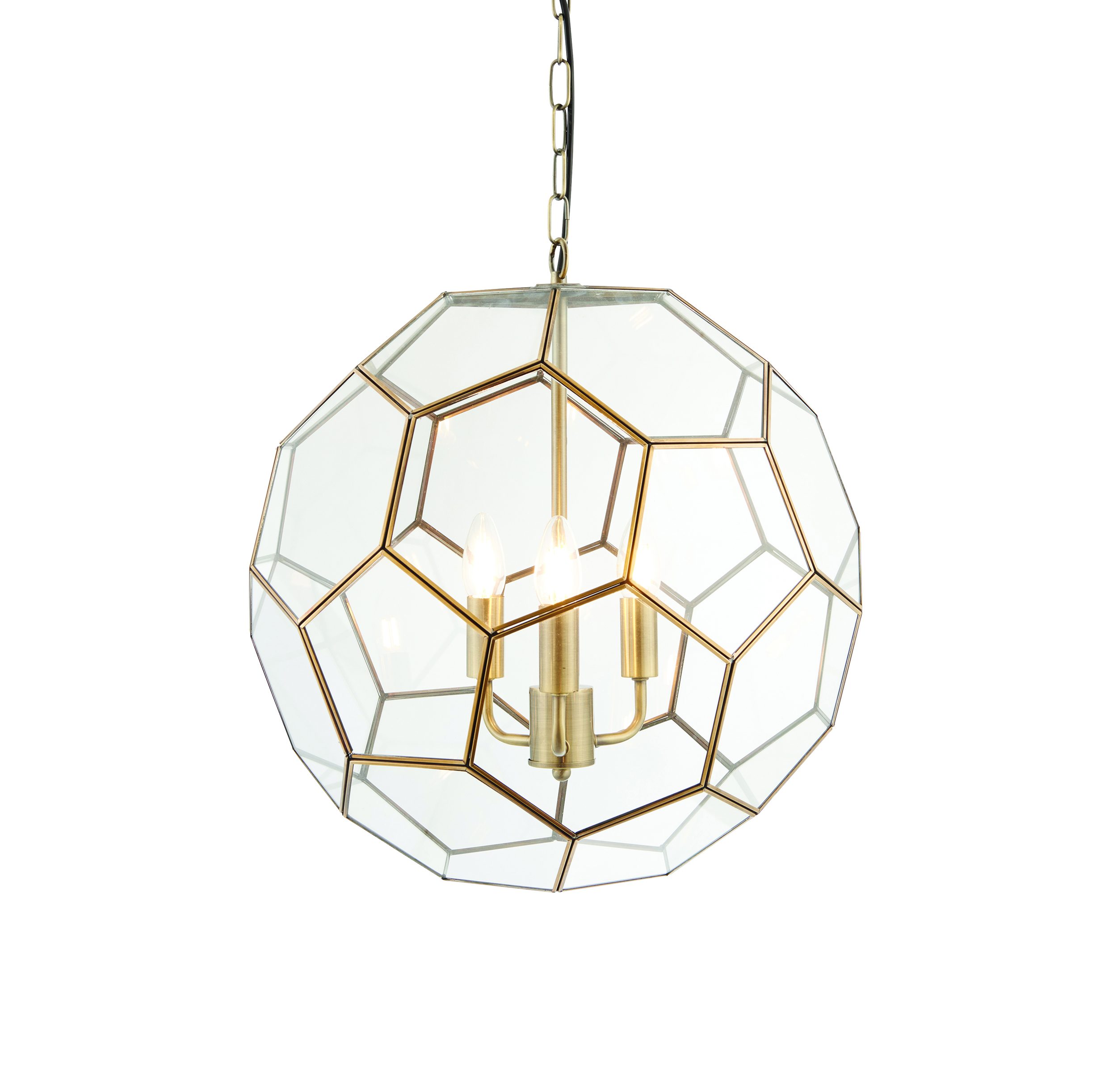 The Miele 3 light pendant has a striking design, incorporating hexagonal glass panels edged in antique brass. Suspended from a decorative chain, dimmable and suitable for use with LED lamps.