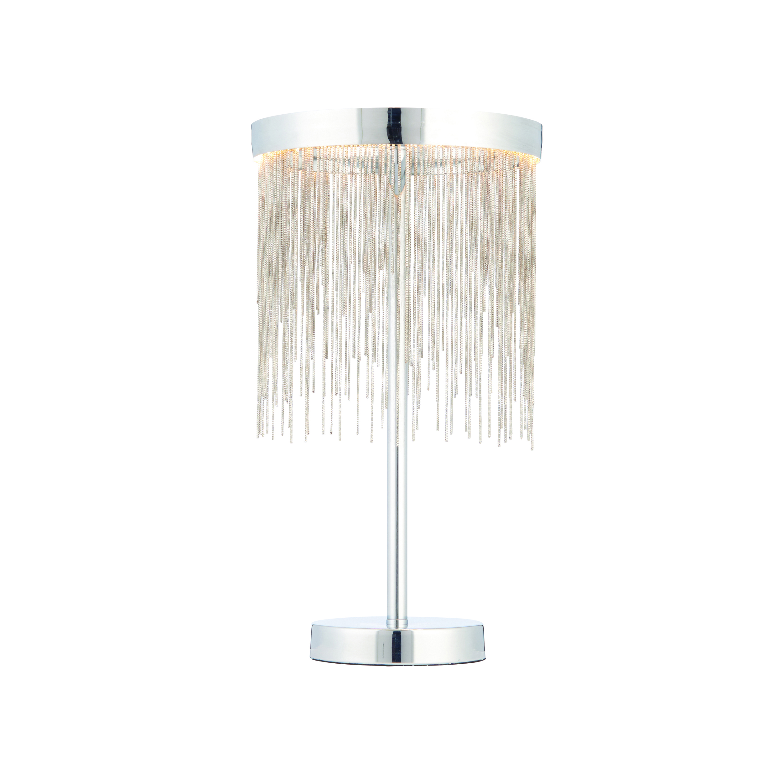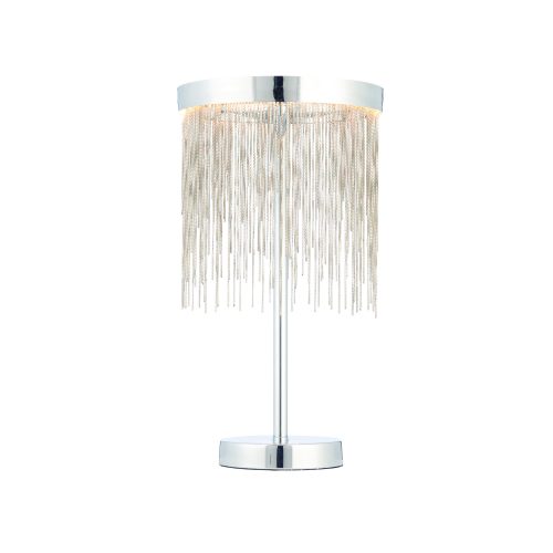 Contemporary LED table lamp with a ring of LED lights diffused by a waterfall of hundreds of delicate chains. Perfect for modern interiors and plated in a polished chrome finish.