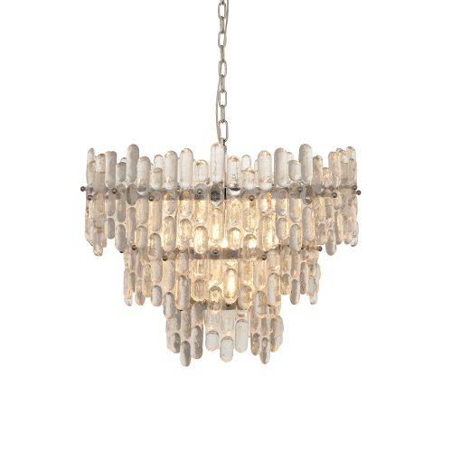 Like delicately melting ice crystals the Maya pendant is formed from multiple clear glass decorations that create the most stunning addition to your home. Impressive and beautiful, perfect to pair with LED filament lamps to achieve an enchanting diffused light effect. Finished in chrome plated metal work and suspended from chrome plated chain with clear flex.