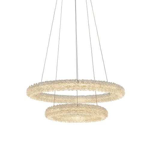 A unique chrome plated, double hoop pendant, inspired by the pattern of quickly formed ice crystals. Over 5,000 faceted crystals form this chandelier. Suspended from delicate, height adjustable clear wire cables. Position over dining tables, in bedrooms or as a centre piece in living rooms for an amazing complement to your interior.