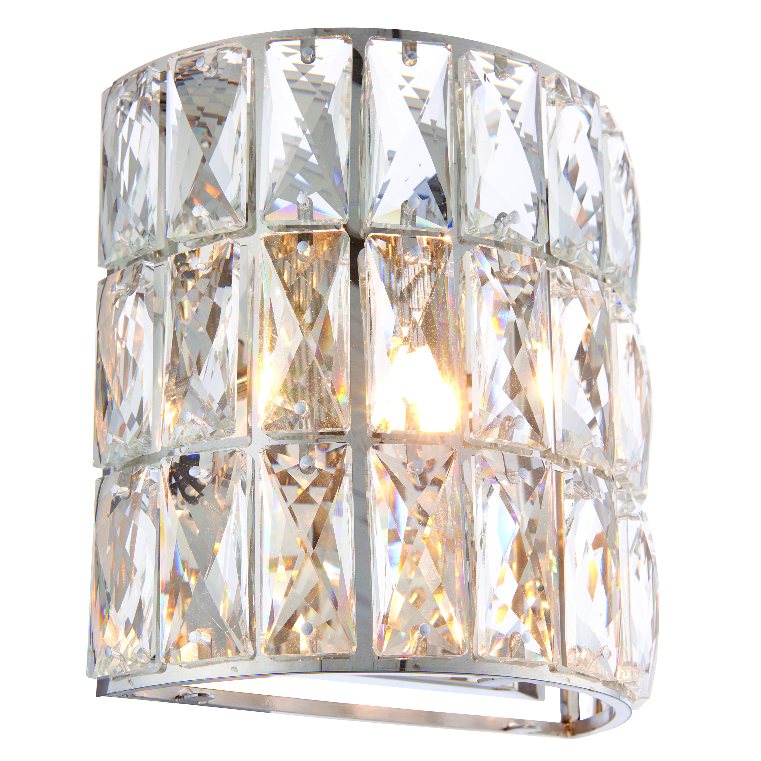 High quality clear crystals adorn this deluxe chrome plated wall light. The combination of clear crystals and polished chrome create a luxurious interior decorative wall light, perfect for bedrooms or living room areas.