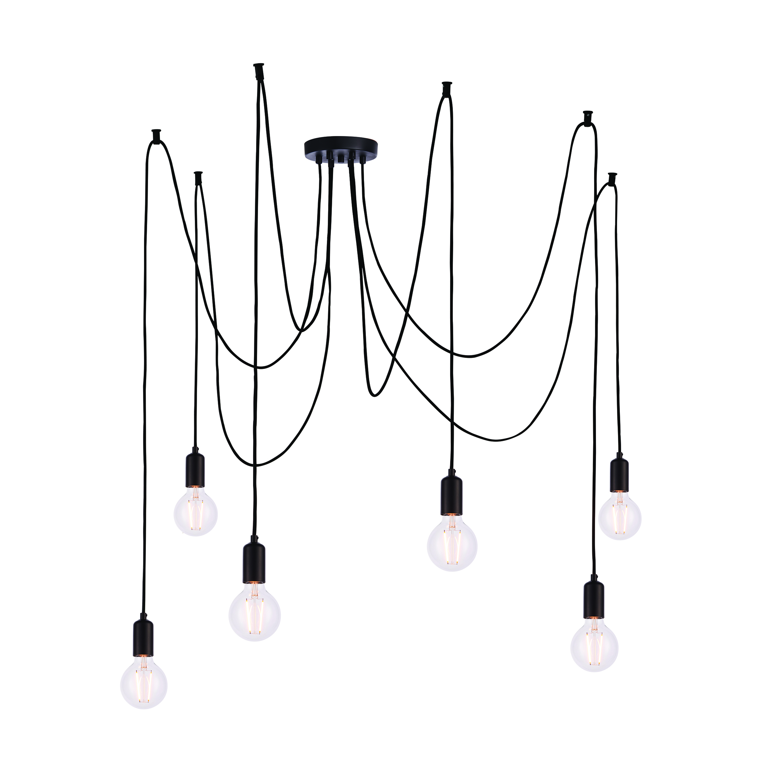 Create that cool urban look with this industrial six light pendant, simple in construction with matt black painted lamp holders suspended from height adjustable black fabric flex. Select the position of each lamp, able to reach over a large area of your interior for perfect illumination.