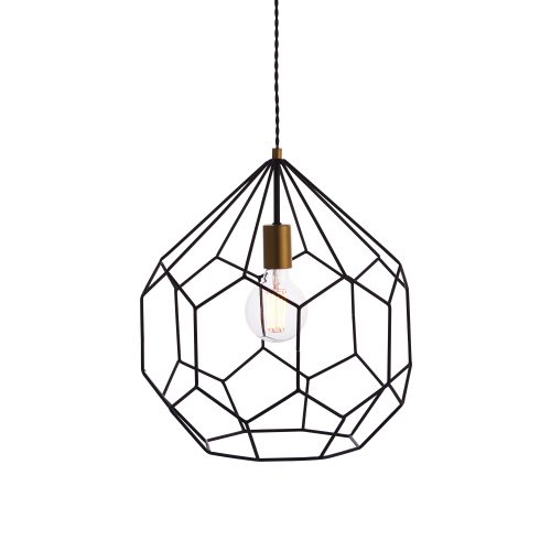 A cool geometric shaped wire frame pendant light, finished in a matt black finish with smart satin gold painted detail. Creating amazing light patterns and suspended from height adjustable twisted black fabric flex, this cool pendant light is perfect for use with filament LED lamps.