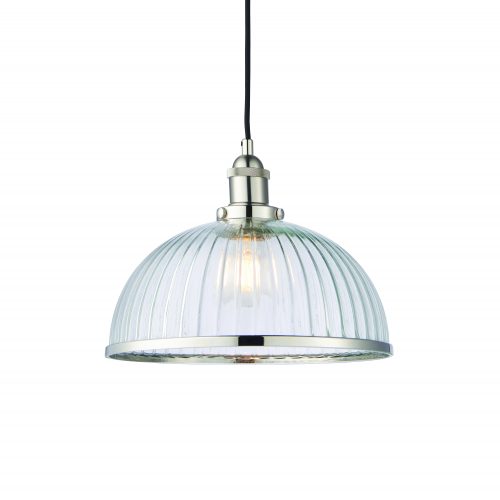 An authentic ‘resto’ style industrial pendant, finished in bright nickel plating with authentic knurled lamp holder details and vintage style clear ribbed glass shades . Suspended from height adjustable black fabric flex, pair with filament LED lamps for that perfect industrial style. The perfect addition for today’s stylish homes to create that on trend bar, bistro look.