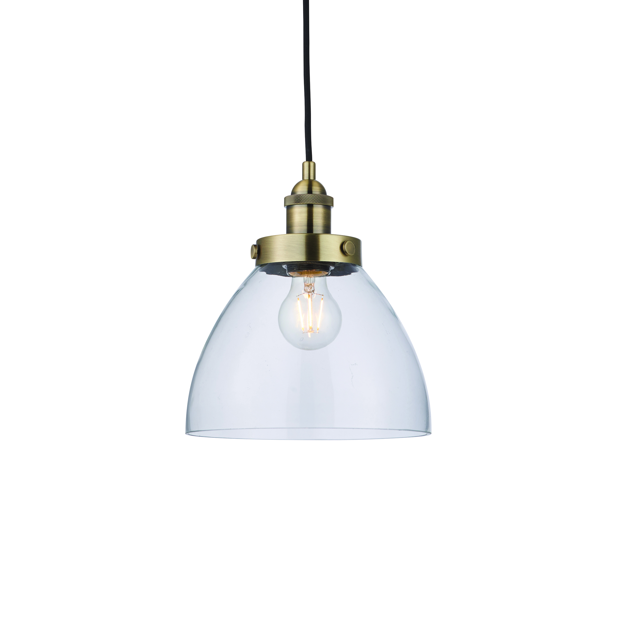 An authentic ‘resto’ style industrial pendant, finished in antique brass plating with authentic knurled lamp holder details and clear glass shades. Suspended from height adjustable black fabric flex, pair with filament LED lamps for that perfect industrial style. The perfect addition for today’s stylish homes to create that on trend bar, bistro look.