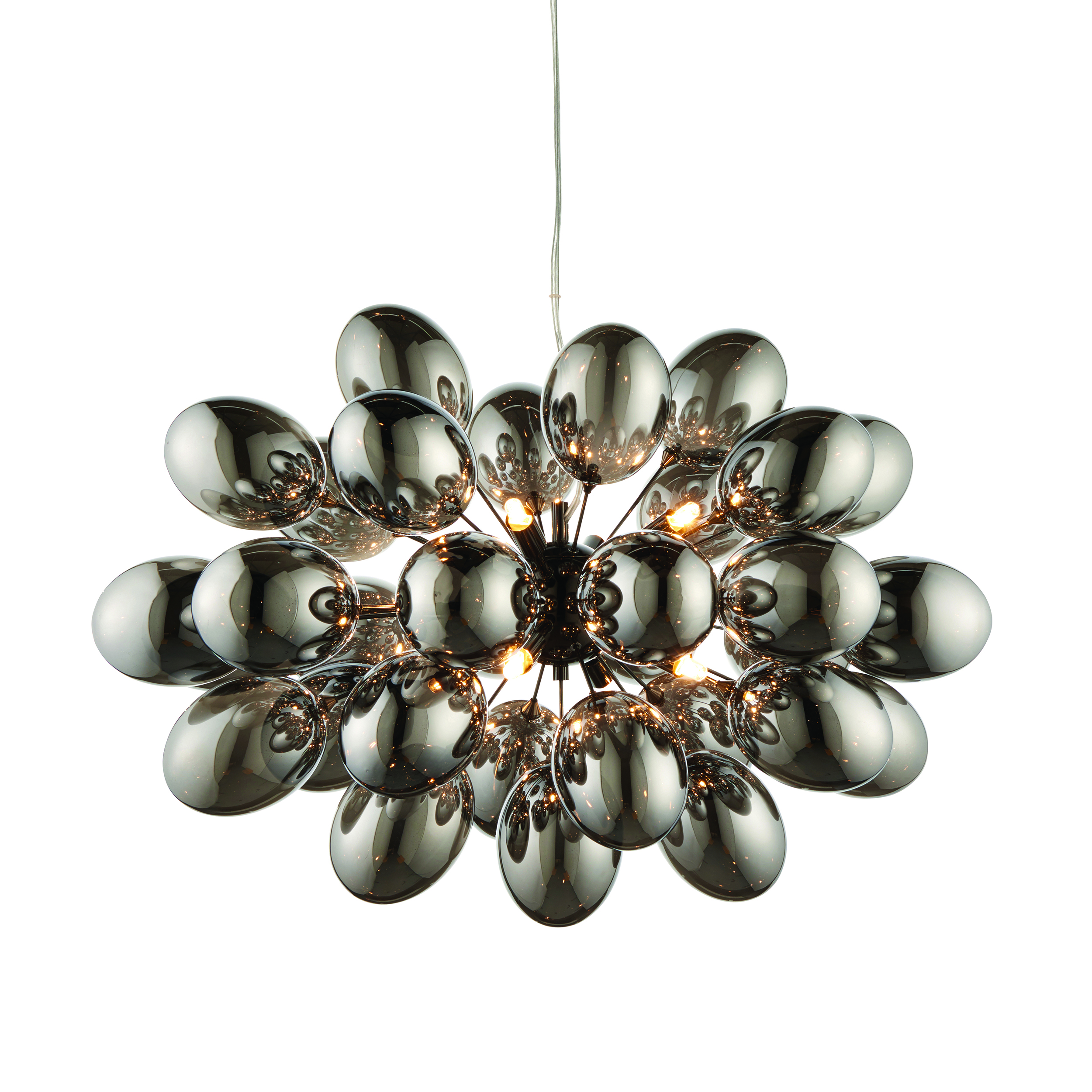 Equally as stunning as the chrome Infinity, is the dramatic black chrome Infinity pendant. Electro-plated dark chrome glass shades and black chrome plated finish combine to achieve a complete sophisticated designer look.