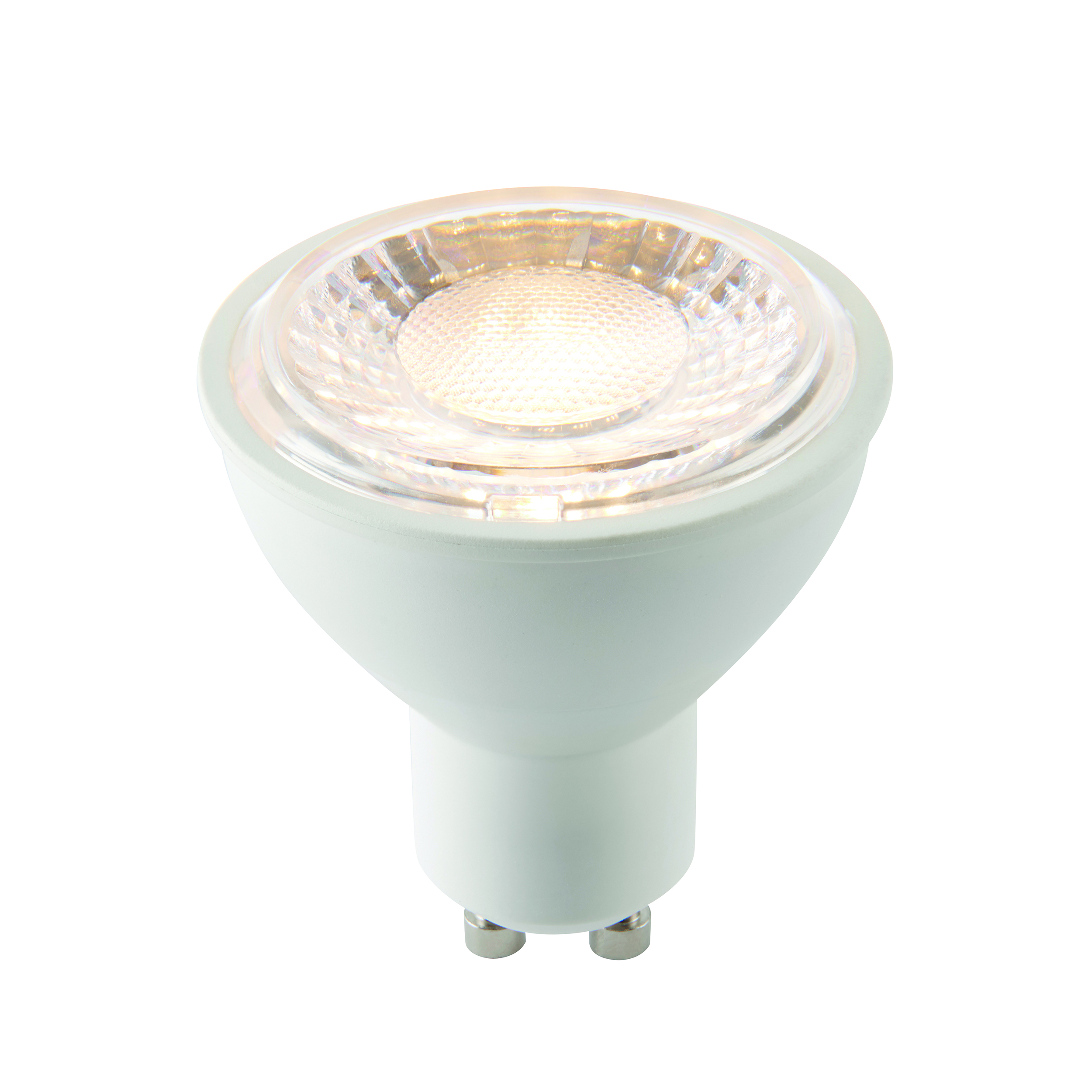 A dimmable and bright 7W SMD GU10 lamp in warm white, incorporating the latest LED technology. This ensures the lamp can be used safely within enclosed heads, such as outdoor, bathroom and fire recessed cans, with no reduction in performance or lifetime. With a beam angle of 60 degrees, this lamp is equivalent to a 75W halogen. Other options available in this range