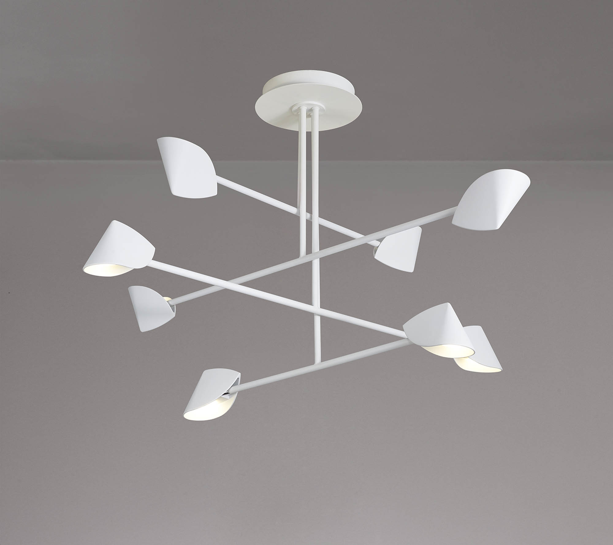 Mantra’s Capuccina range sees an originally designed shade for each integral LED head. This unique feature appears as an irregular cone shape formed from folds of metal plates. The pendant and ceiling lights have tiers of adjustable bars making a scattered display of the light sources which can be adjusted as desired. A fully comprehensive collection, Capuccina also includes, wall, table and floor lamps and each item is available in either a black or white colour finish with warm white LEDs.