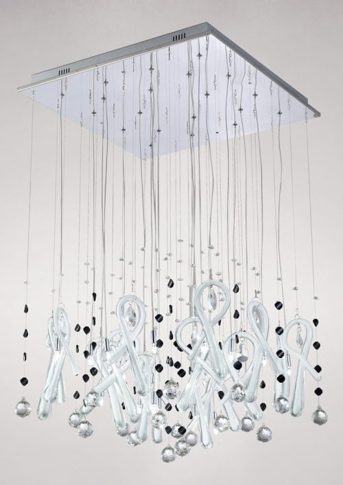A stunning range of round and square Polished Chrome flush fittings. They are dressed with sizable looped hand crafted clear glass that has either White or Black gloss resin filled within. Strings of Asfour crystal spheres and contrasting glass stones are suspended through the fixtures in harmony with the looped glass.  The final effect is exquisite.  Compatible dimmer switches are available upon request.