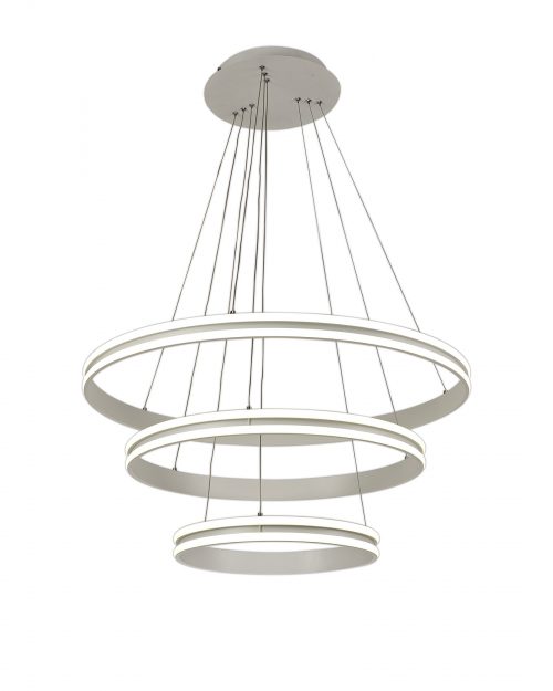 Dover is an integral LED, adjustable pendant light. The lone item in this range is an impressive modern design which boasts an immense 100W output. In instances where the optimum amount of illumination is not required this light is also suitable to be dimmed with a suitable dimmer module. Comprised of three different sized 4000K LED loops, with a band of matt white metalwork between the diffusers, a puppeteer hanging method has been applied to each ring so they can be left level or individually angled to create a bespoke ascetic.