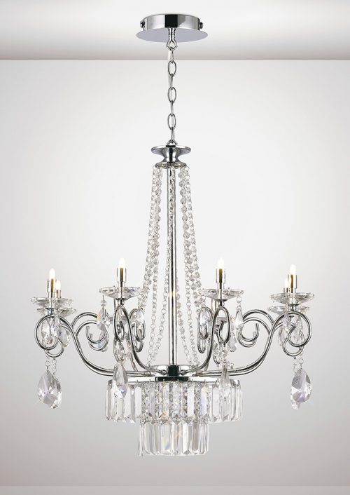 Eden is a collection of 2 chandelier pendants, supplied in a 4 or an 8 light. Constructed with a chrome finish, the central column provides a strong framework for the lampholders and glass sconces. The crystal adornment completes the arms while the rectangular crystal at the bottom is tiered to draw the eye upwards.