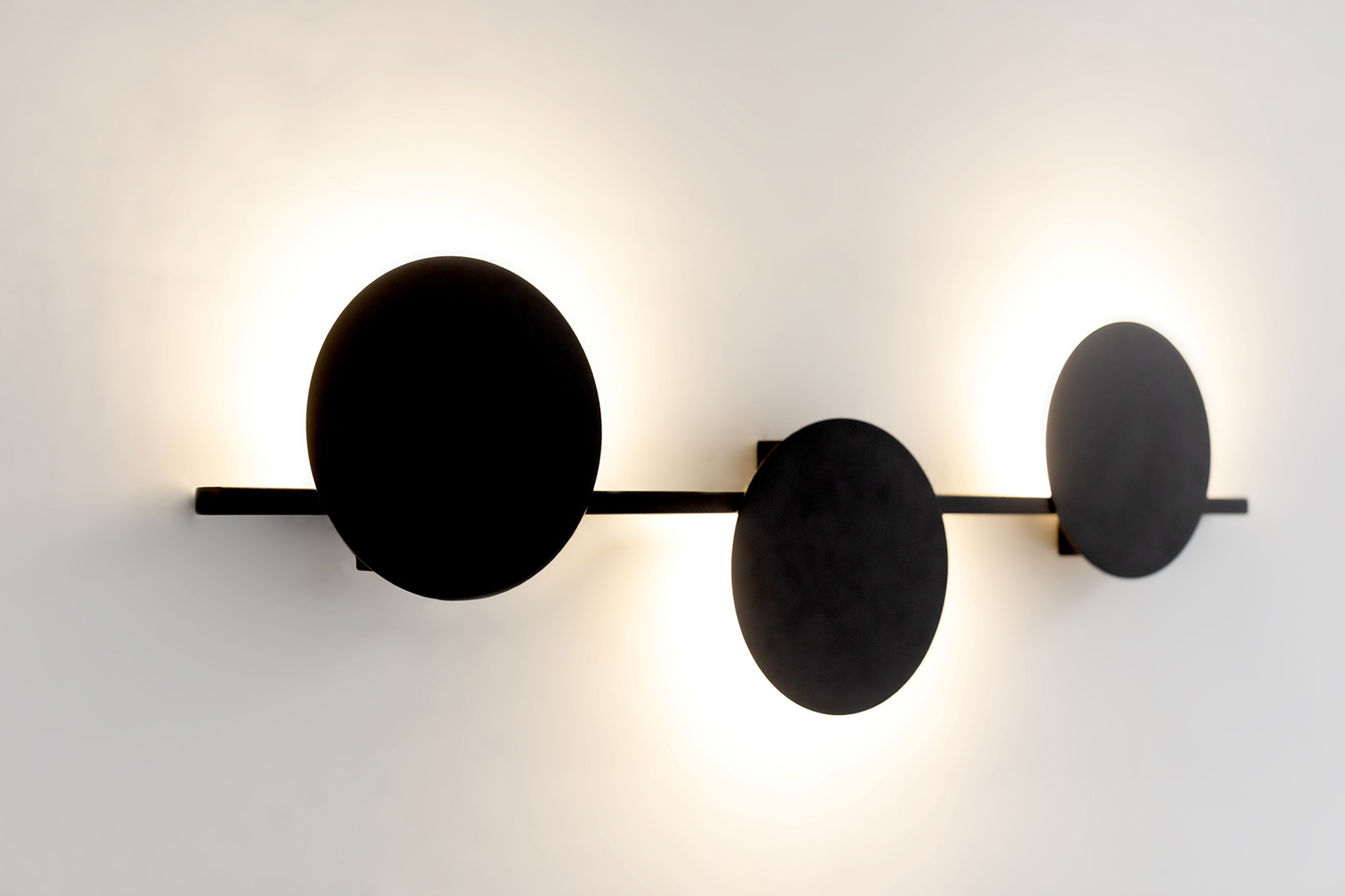 The Eris range uses opaque metal plates to create circular silhouettes, enhanced by the warm white 3000K integral LEDs. This backlight effect creates an ambient halo of light. Available in three sizes each wall lamp has either a black or white finish to combine for a monochrome feature or use individually to subtly blend with the most suitable colour tone for the setting.