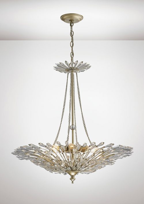 Fay is a remarkable collection of tiered pendant crystal lights and a wall bracket. Finished in Aged Gold/Silver the result is decadent and show stopping. The crystal pieces are displayed like feathers, creating a luxurious light and interesting patterns as the light bounces off the crystal. Fay is a regal design for Diyas.