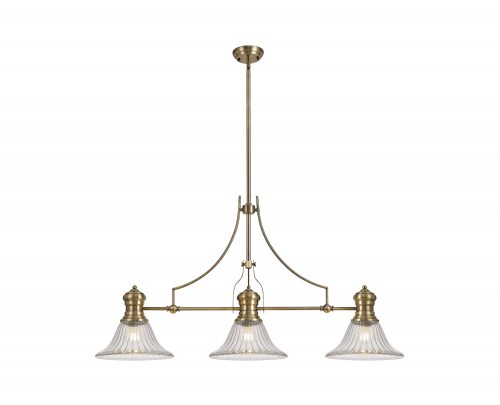 Industry 3 Light Linear Pendant E27 With 30cm Bell Glass Shade, Antique Brass, Clear