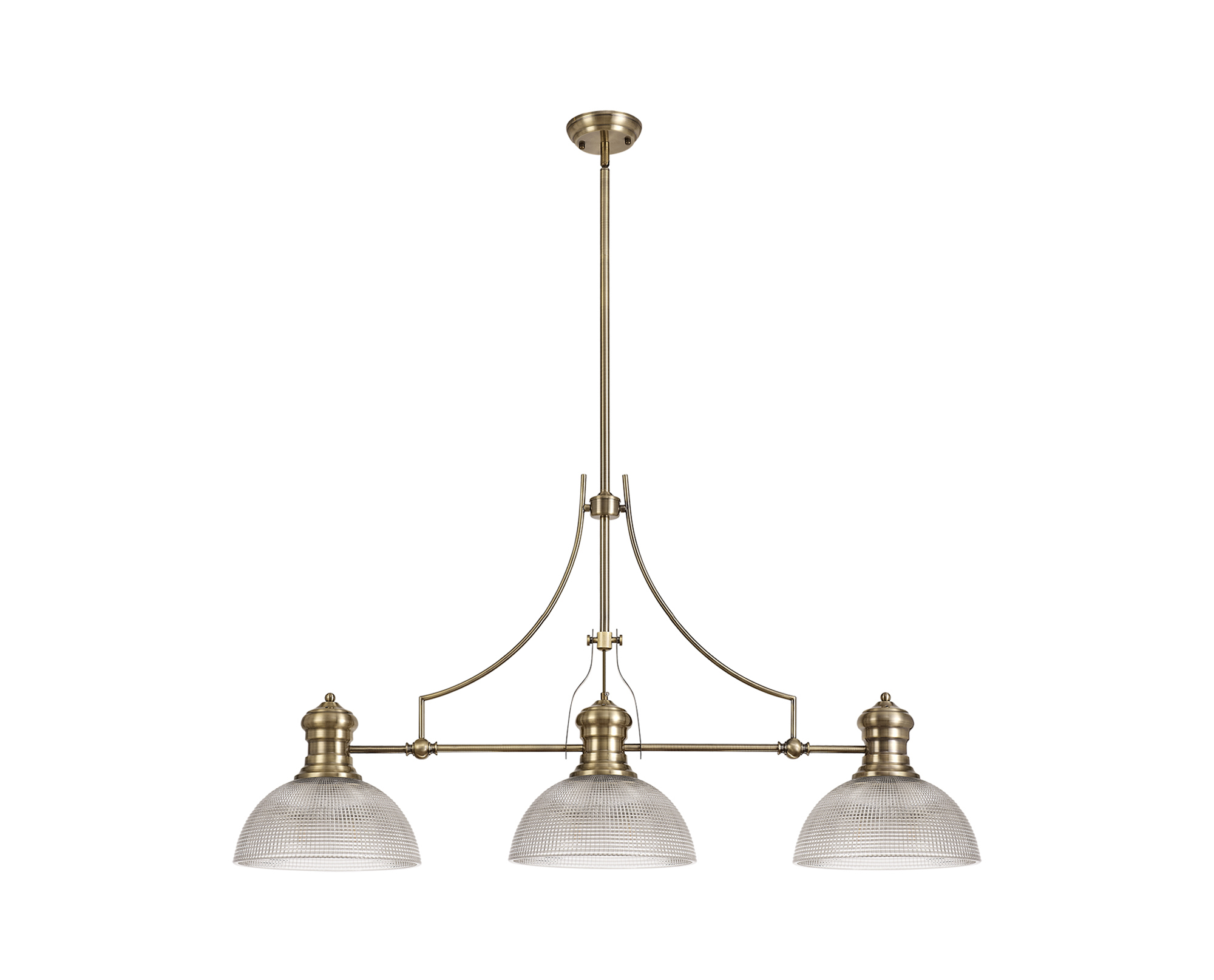 Industry 3 Light Linear Pendant E27 With 30cm Prismatic Glass Shade, Antique Brass, Clear