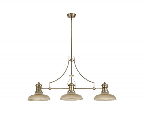 Industry 3 Light Linear Pendant E27 With 30cm Round Glass Shade, Antique Brass, Amber