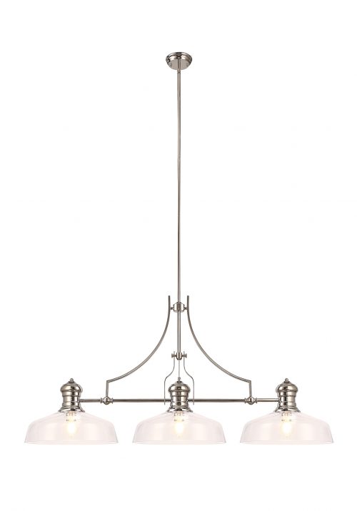 Industry Linear Pendant With 38cm Flat Round Shade, 3 x E27, Polished Nickel/Clear Glass