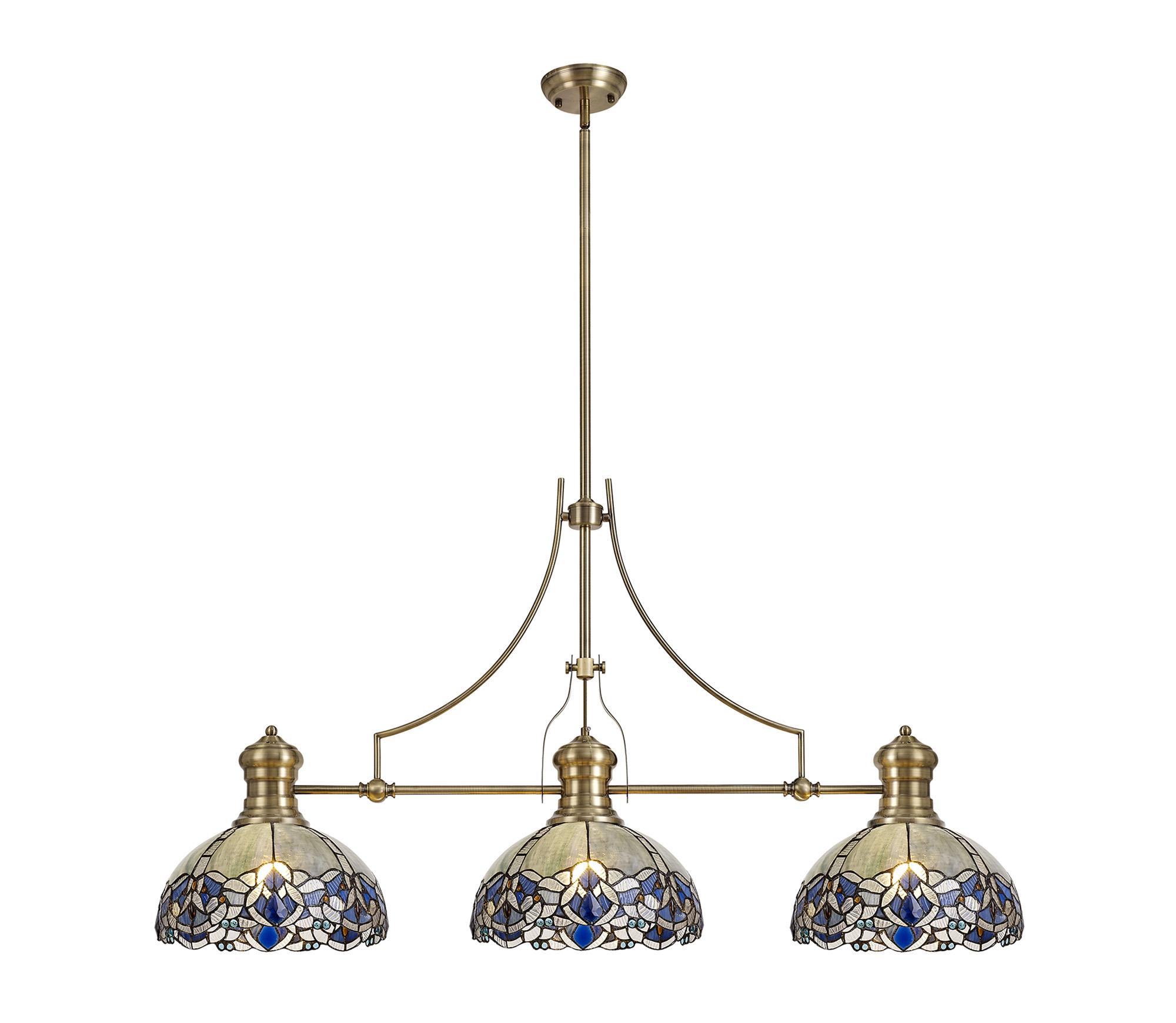 Industry, Nunney 3 Light Linear Pendant E27 With 30cm Tiffany Shade, Antique Brass, Blue, Clear Crystal
