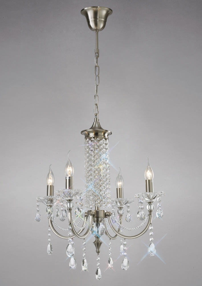Leana is a traditional range of chandeliers and a single wall lamp finished in Satin Nickel, designed around vintage inspirations. The fitting brings a modern element in the form of beaded crystal strands paralleled from the centre column along the arms, combined with crystal droplets hanging from the arms and sconces. The substantially sized pendalogue crystals displayed at the bottom of the frame create an eye-catching centre piece.