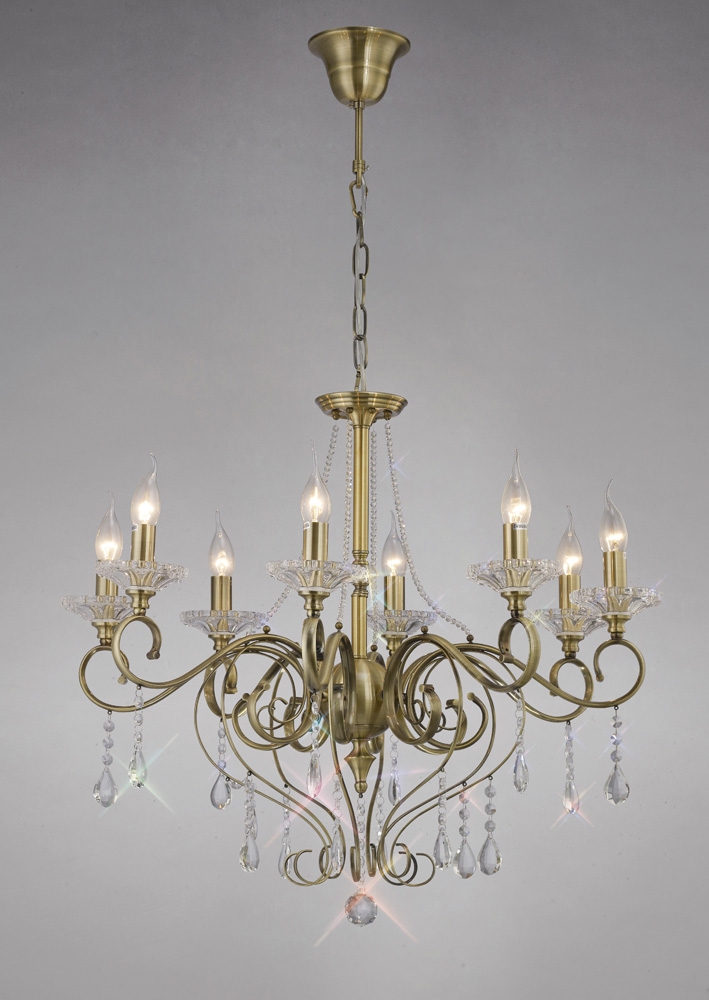 Libra introduces a contemporary decoration to a traditional design. The Antique Brass finish combined with the sleek curvature of the contrastingly sized arms is accompanied by a multitude of crystal drops, complimenting the crystal orb fixed in the middle of the centre column.  Each lampholder is concealed by an Antique Brass candle drip which sits above a traditional crystal sconce.