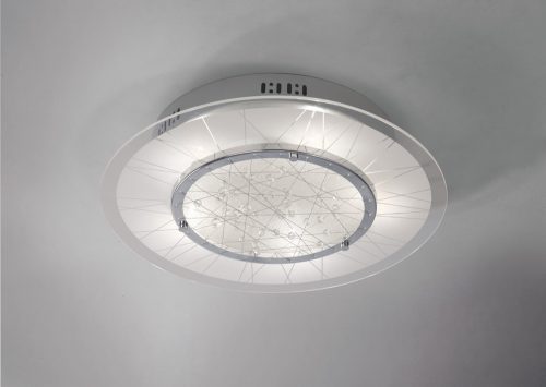 This design brings a new era to flush ceiling fittings with the frosted glass presenting a series of spontaneous lines that lead effortlessly into the central feature. Wired strands are irregularly positioned and have randomly spaced crystal beads threaded over a textured frosted glass back drop. The crystal beads catch the light and offer a discreet yet impressive sparkle. Clear lines within the frosted glass are designed to emulate the central strands.