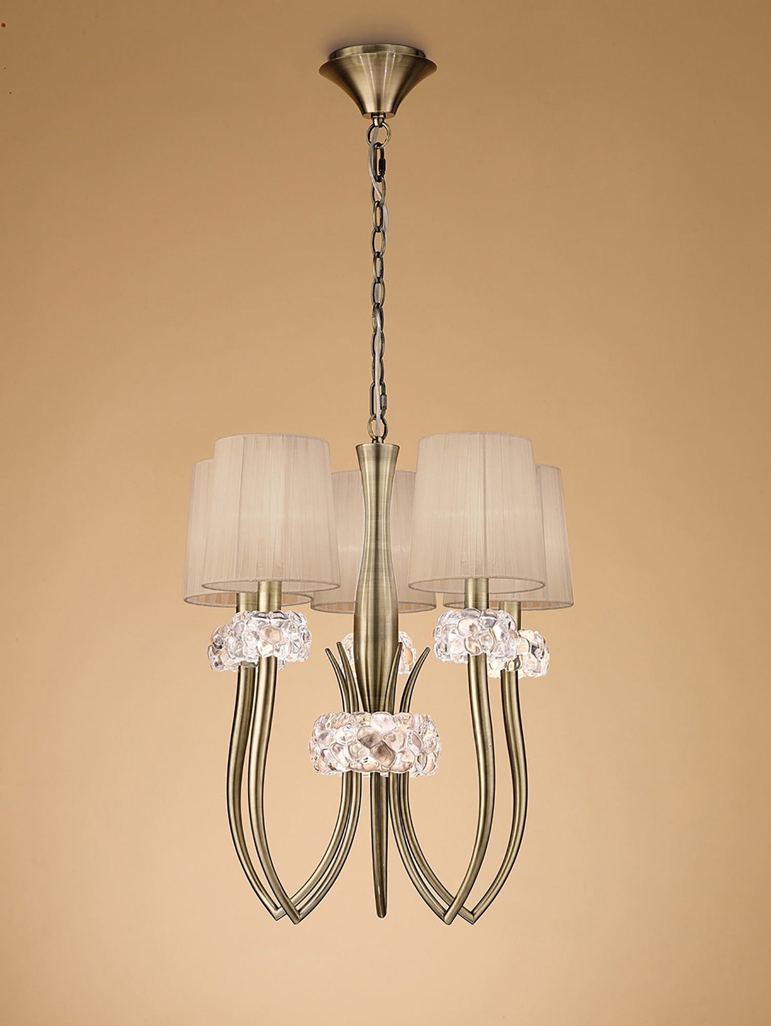 Loewe collection is a mixture of gentle and simple stroke arms that amalgamate in the centre behind the unique details of a large bubbled shaped glass. Each arm also effortlessly combines the dynamic shape of the bubble glass sconces with the elegant white organza shades. The arms are artistic strokes of polished chrome that vary in diameter, subtly defining the grace of this design. The full range is also available in antique brass which is complimented with cream organza shades for a warmer effect. The floor lamp also has a particularly unique design as it poises on three legs. Loewe is the epitome of refined lighting.