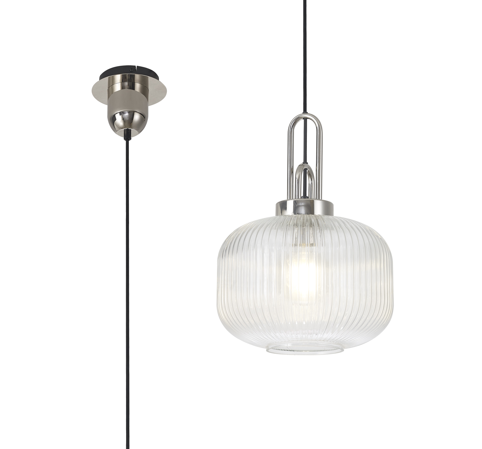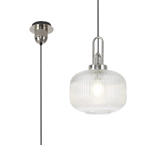 London 1 Light Pendant E27 With 30cm Pumpkin Shaped Ribbed Glass, Clear Polished Nickel/Matt Black