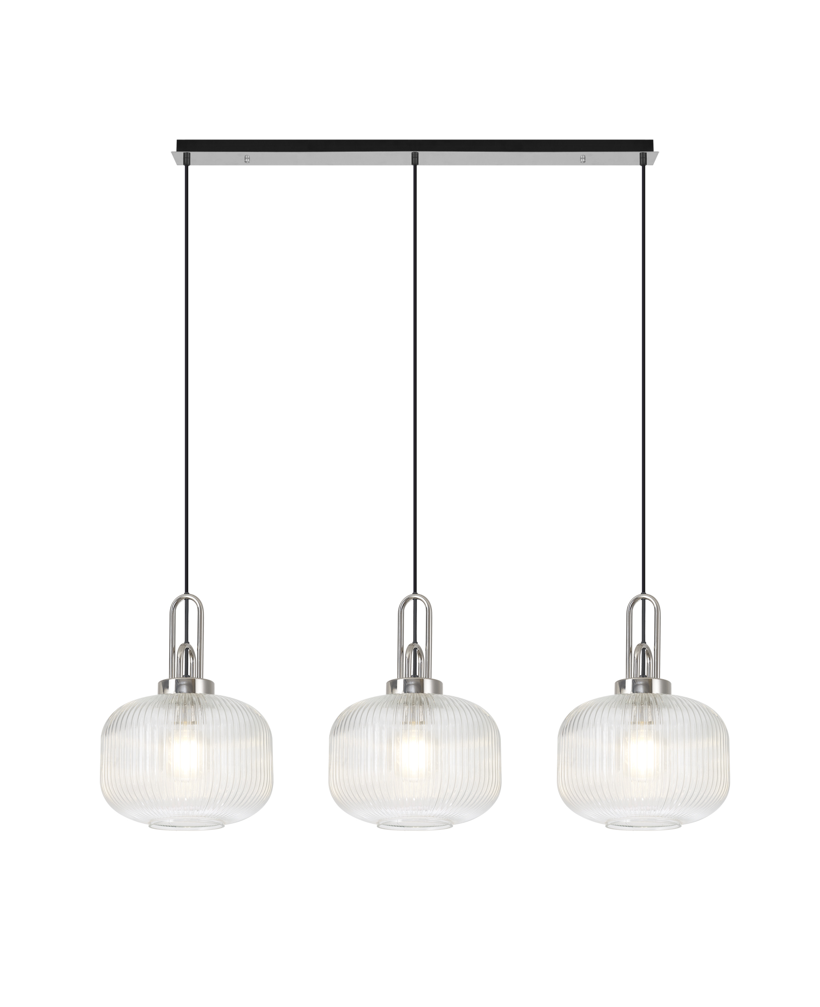 London Linear 3 Light Pendant E27, Polished Nickel/Matt Black With 30cm Round Ribbed Clear Glass
