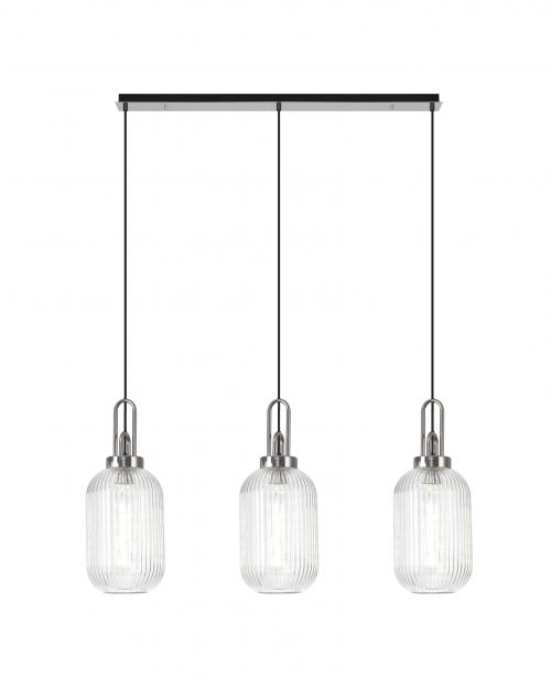 London Linear 3 Light Pendant E27 With 20cm Tubular Ribbed Glass, Clear Polished Nickel/Matt Black