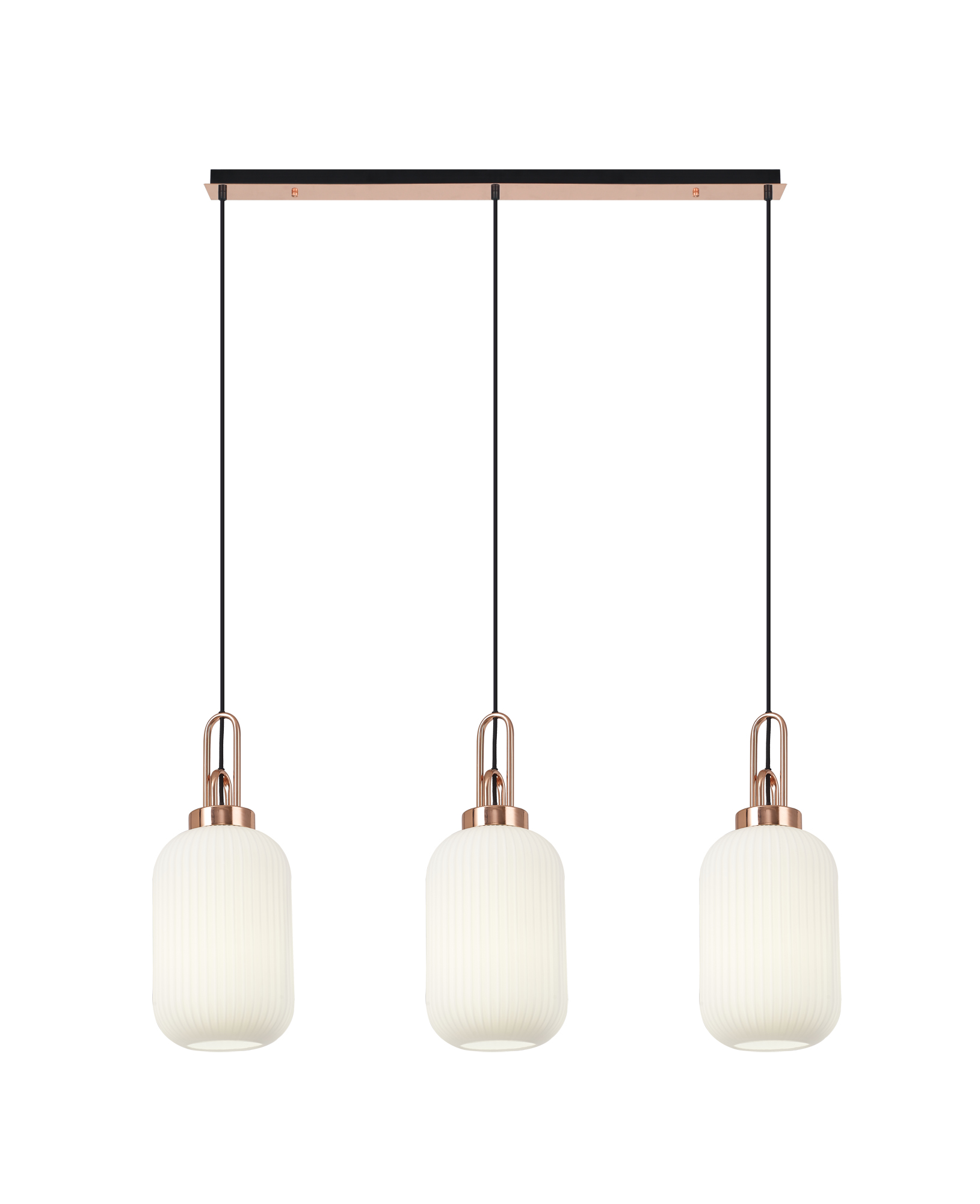 London Linear 3 Light Pendant E27 With 20cm Tubular Ribbed Glass, Opal Copper/Matt Black