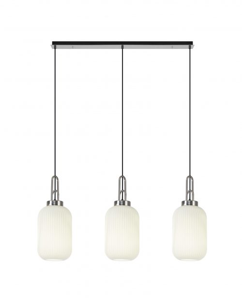 London Linear 3 Light Pendant E27 With 20cm Tubular Ribbed Glass, Opal Polished Nickel/Matt Black