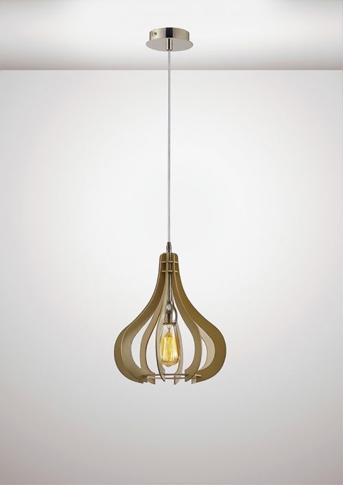 Lorna is a collection of 2 singular pendants that combine beige finished wood with Polished Nickel. This light takes inspiration from natural elements and is simple yet effective in shape. Available in Small or Large sizes, this light is versatile and will not age in style. Shown with a vintage style lamp not included, the finished look would suit vaulted ceilings and lofts.